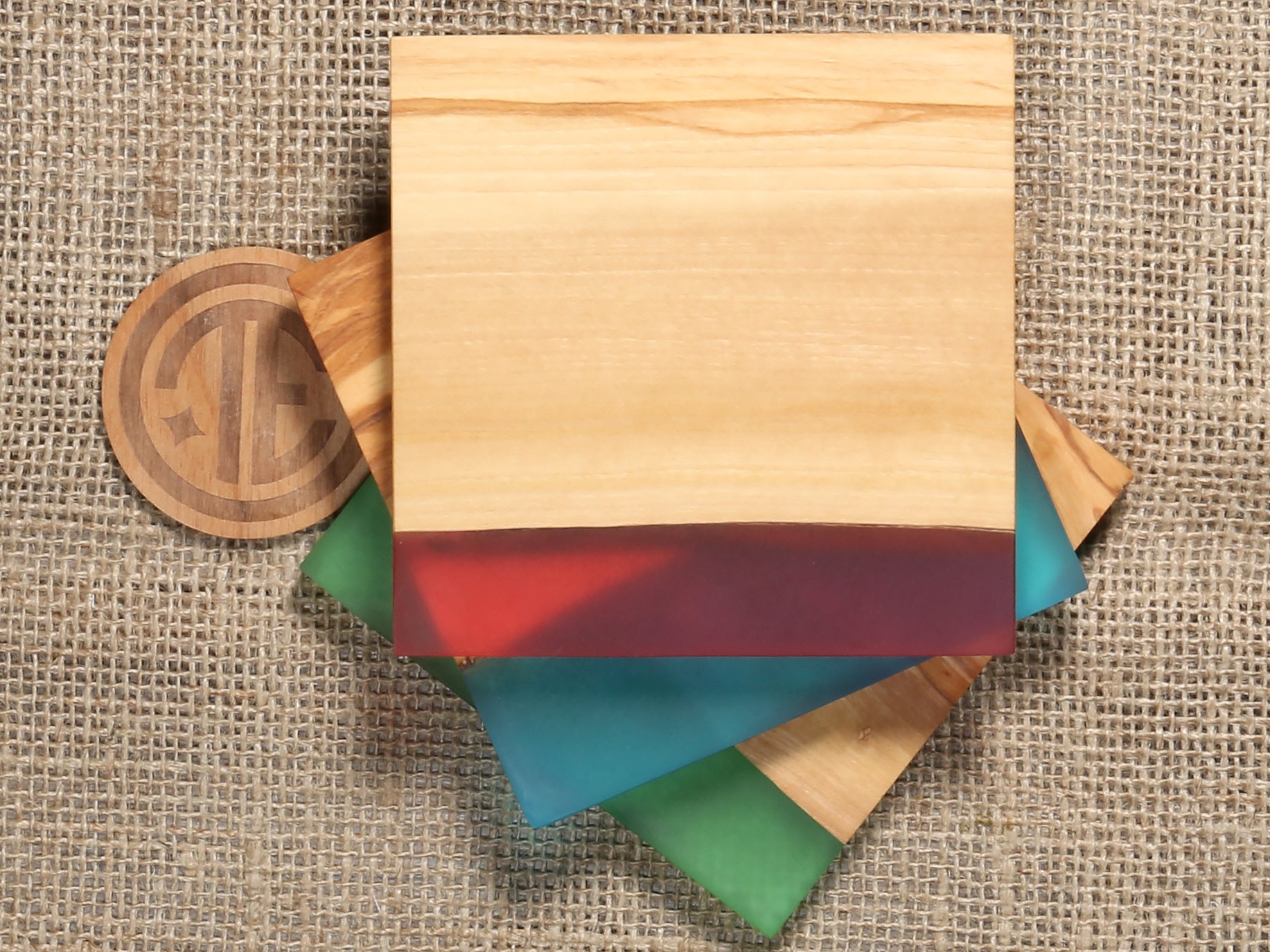 The olive wood coasters have an edge of colorful resin. The contrast between the natural coloring of olive wood and the resin makes this coaster set really striking. Through the resin you can see the stunning natural edge of the olive wood. Each coaster is unique, making this set of 4 coasters a great, unusual gift.