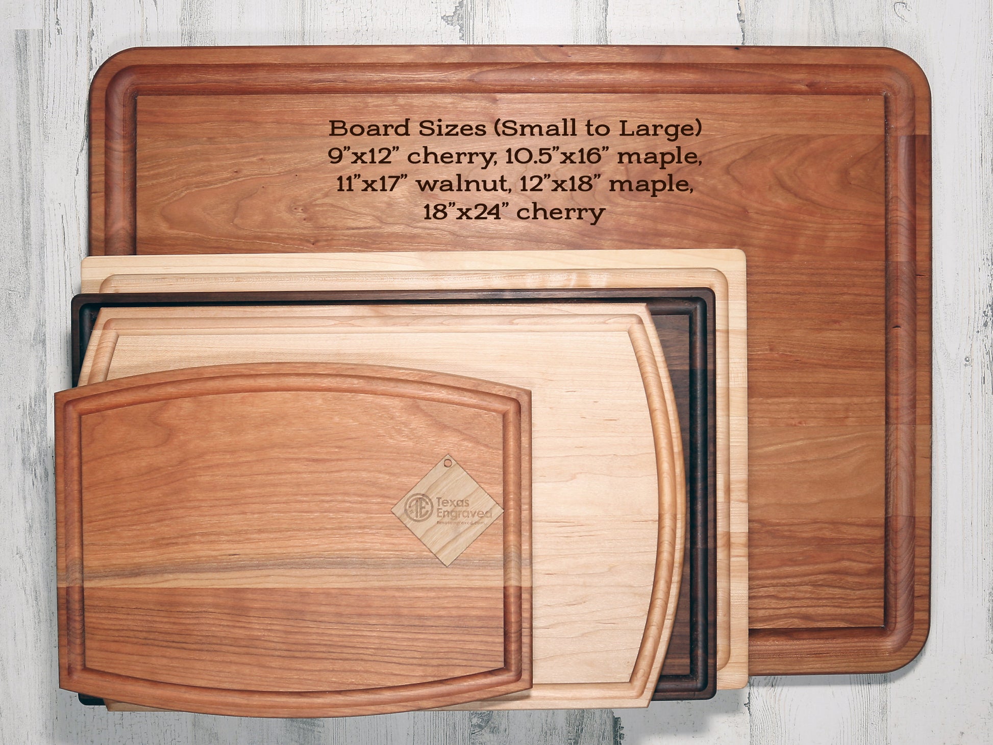 All of our maple, walnut and cherry cutting boards are sourced from 100% North American hardwoods (maple, walnut and cherry), and are hand inspected, engraved, sanded and hand-finished in our workshop in Texas. This is truly a "Made in America" product. Please be aware that natural wood products can and will vary in color, grain and engraving tone. Your finished board will vary in appearance from the representative image. No matter, we are sure your board will exceed your expectations!